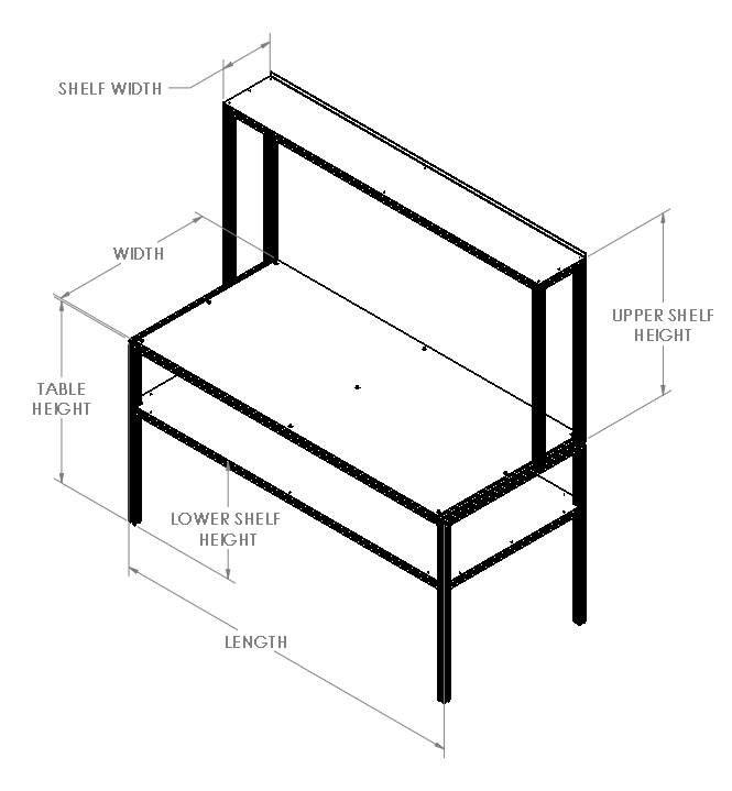This configurable product is a workbench with a low shelf and a high shelf. The frame is made from aluminum t-slot profiles, the shelves are sheet metal, and the top can be made from any work-surface material. The length, width, height, for the table and shelves are all adjustable.