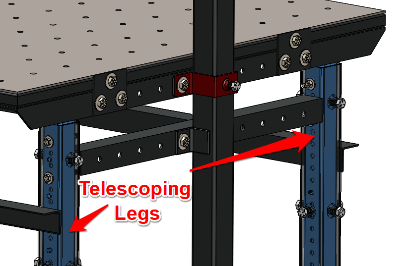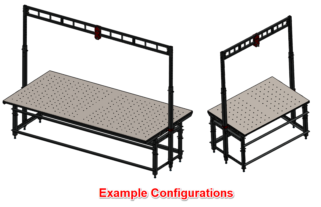 This configurable product is a weld table with an overhead hoist. The height of table and height of hoist can be adjusted as needed by sliding and bolting telescoping tubes. This table can be purchased in any length between 60" and 120", and any width between 40" and 60"